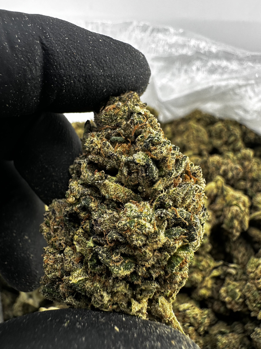 The nugs are dense and sticky, breaking up fresh with that satisfying snap. Dark green buds are accented by subtle purple hints and wrapped in thick orange hairs, giving it that rugged, classic gas strain look that seasoned smokers appreciate.